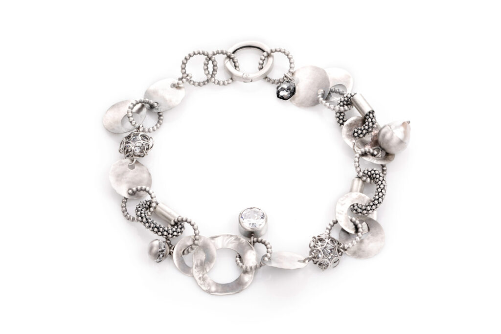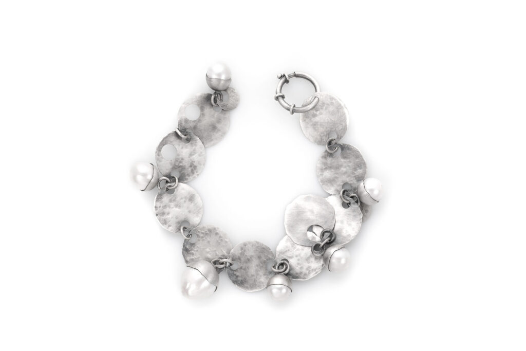 Dużych rozmiarów bransoleta z perłami. Matowione srebro z możliwością zmiany długości.